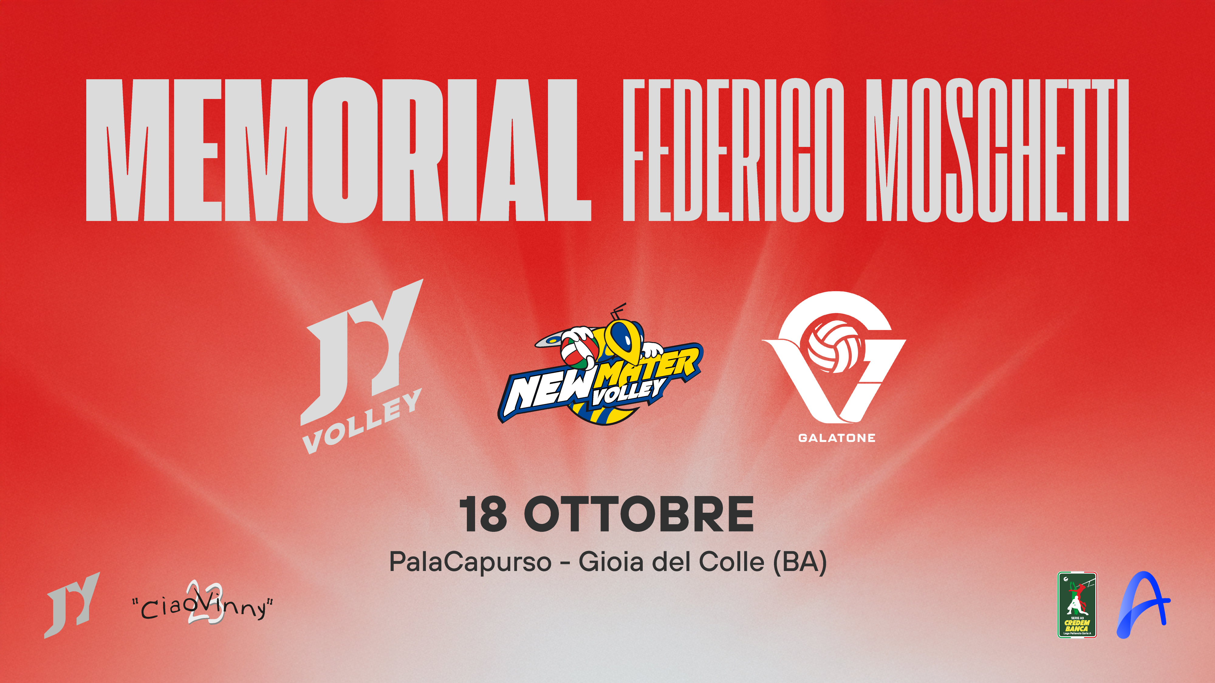 L’evento vedrà in campo Joy Volley Gioia del Colle, BCC Tecbus Castellana Grotte e Green Volley Galatone in una giornata che unisce sport, comunità e solidarietà. Oltre all’aspetto agonistico, il Memorial rappresenta un momento di condivisione e ricordo collettivo, fortemente voluto dalla società biancorossa e dalla famiglia Moschetti, che sarà presente sugli spalti insieme ai tanti amici di Federico.